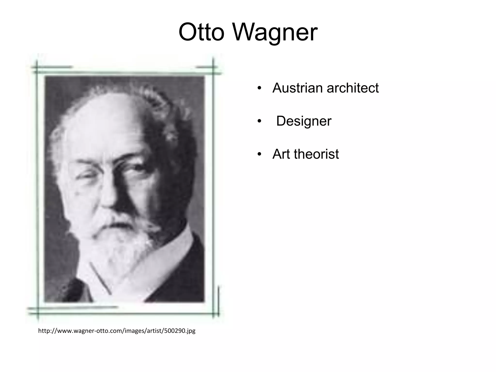 Otto Wagner was an influential Austrian architect, designer, and art theorist active in the late 19th century. He helped pioneer modern architecture and was a leading figure of the Vienna Secession movement. Some of his most notable works include the Karlsplatz Station in Vienna, featuring ornate Art Nouveau details; the Majolica House, one of his first Art Nouveau residential buildings characterized by linear facades; and the Church of St. Leopold, featuring organic ornamentation and minimal color schemes. Wagner's students, such as Josef Hoffmann and Max Fabiani, were also influential modern architects and incorporated his emphasis on simple geometric forms and minimal decoration in their own landmark buildings.