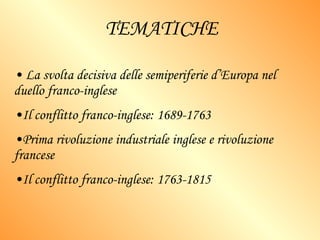 Il documento analizza il conflitto franco-inglese per l'egemonia durante il periodo dal 1689 al 1815, evidenziando le cause economiche e politiche che hanno influenzato le dinamiche di potere in Europa e nel commercio globale. Viene discussa la rivoluzione industriale in Gran Bretagna e la rivoluzione francese, sottolineando come entrambe abbiano impattato sull'economia e sulla società. Inoltre, si esplorano le conseguenze di queste guerre sull'equilibrio commerciale e sulla crescita economica delle potenze coinvolte.