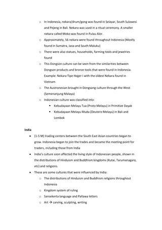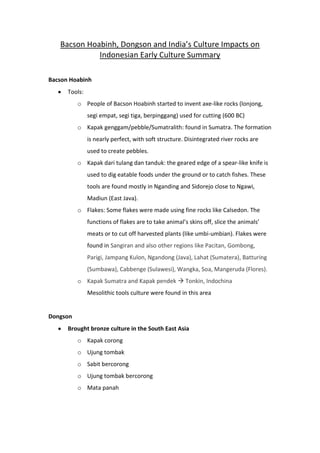 1. The document summarizes the early cultures that influenced Indonesia, including the Bacson Hoabinh tools from 600 BC, Dongson bronze culture from Vietnam, and India's cultural impacts starting around 1-5 AD. 2. Dongson culture brought bronze tools to Southeast Asia and is seen in the similarities between artifacts found in Vietnam and Indonesia, like nekara drums. 3. India's culture and religions like Hinduism and Buddhism spread through Indonesia starting around 1-5 AD, as shown through kingdom systems, language, art, and religious artifacts found throughout the archipelago.