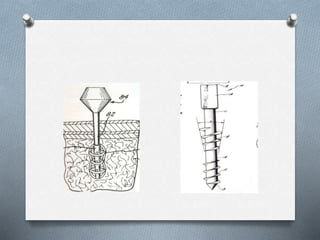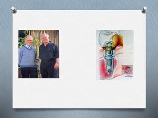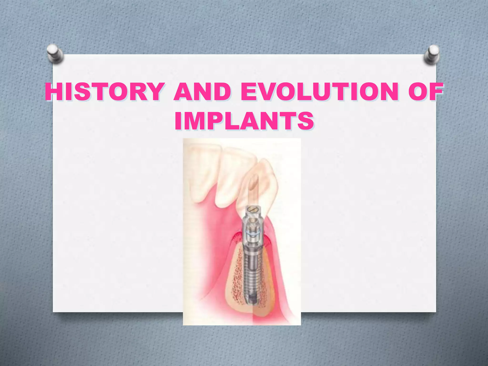 The document provides a history of dental implants from ancient times to the modern era. Some key points discussed include: