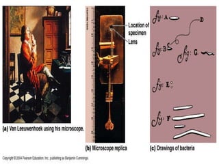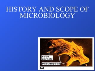 - The document discusses the history and scope of microbiology, from early observations of microorganisms in the 1600s to modern discoveries and applications.