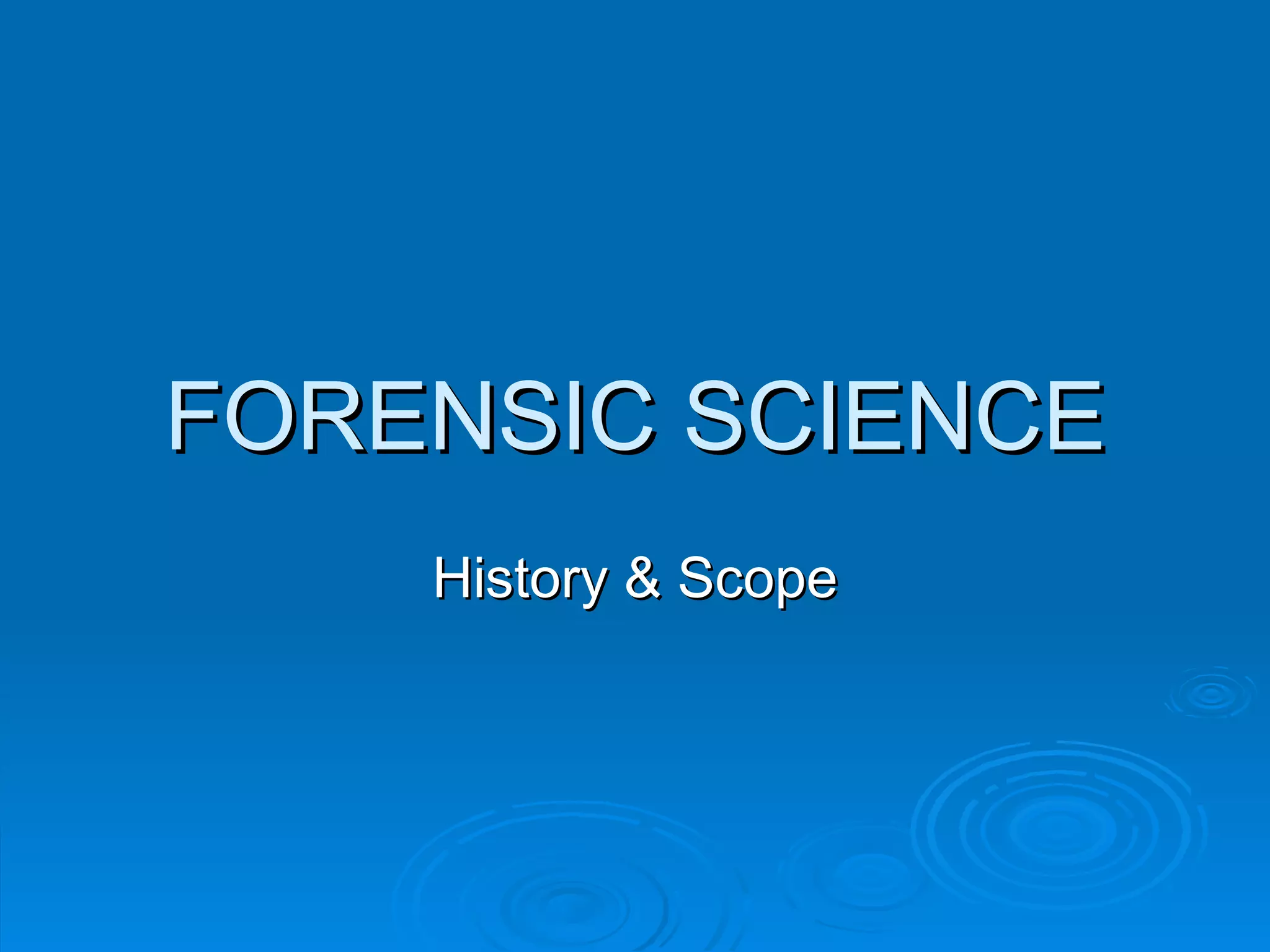 Forensic science is the application of science to criminal and civil law. The history of forensic science began with early developments in China and Europe in the 3rd century and 18th century, where scientific methods were first applied to investigate crimes. Over the 19th century, many scientific disciplines were increasingly applied to criminal investigations, including toxicology, fingerprints, and serology. In the 20th century, breakthroughs like DNA profiling revolutionized the field, allowing positive personal identification. Today, modern crime laboratories employ various scientific disciplines and technologies to analyze evidence and assist law enforcement.