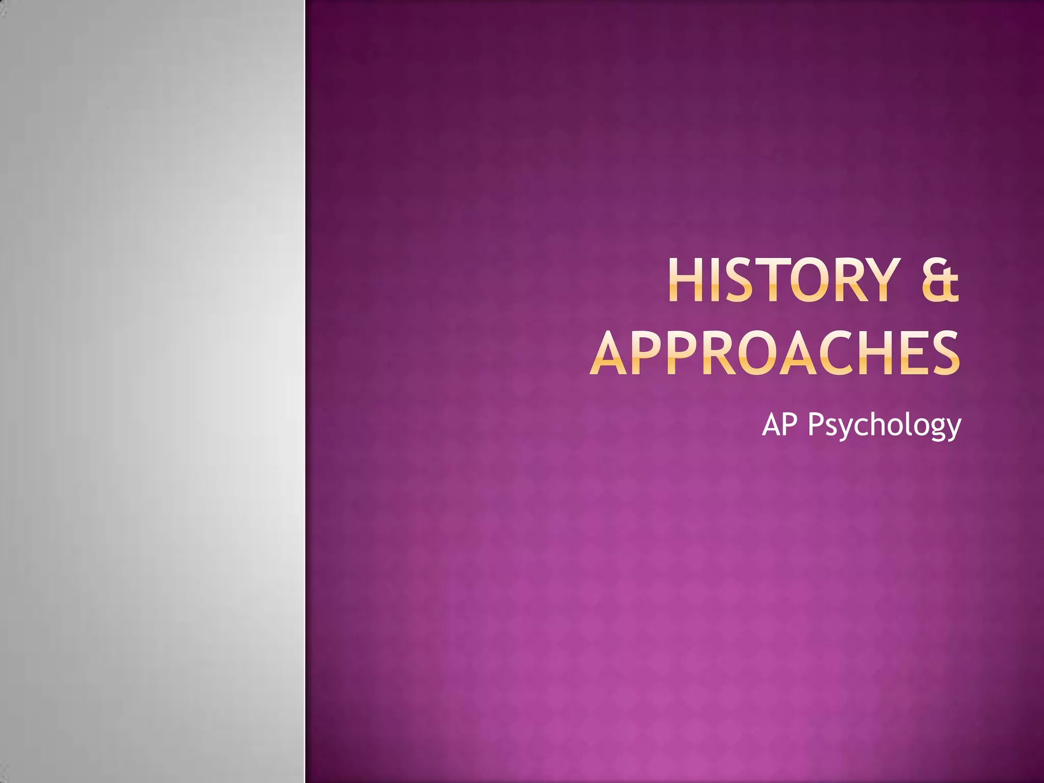 This document provides an overview of the key topics covered in an AP Psychology course, including major theories, approaches, figures, and areas of psychology. It discusses structuralism, functionalism, behaviorism, and other major schools of thought. Additionally, it outlines the nature vs nurture debate, levels of analysis, and biological, behavioral, cognitive, and other perspectives. Major areas of psychology like developmental, social, and clinical psychology are also summarized.
