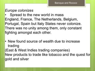 The document provides an overview of Baroque and Rococo architecture and art in Europe between the 17th and 18th centuries. It discusses the spread of European colonization and the wealth this brought monarchies. The Protestant Reformation led Catholic churches to use elaborate ceremonies and art to attract followers. The Baroque and Rococo styles featured complex geometric forms, use of light and shadow, and ornate decor. Examples are given of churches, palaces and other buildings built in these styles in Italy, Austria, Germany and France by architects like Bernini, Borromini, Neumann and Mansart.