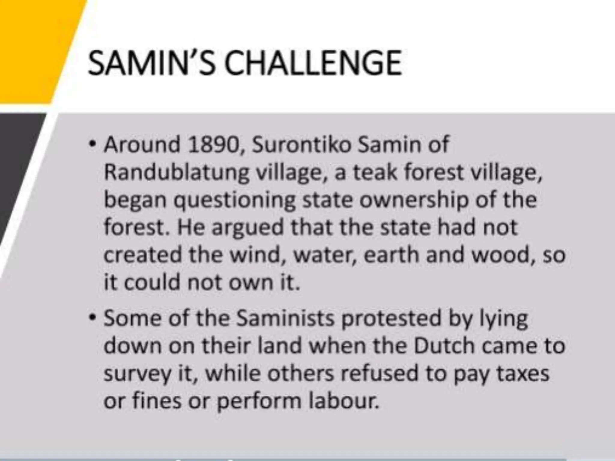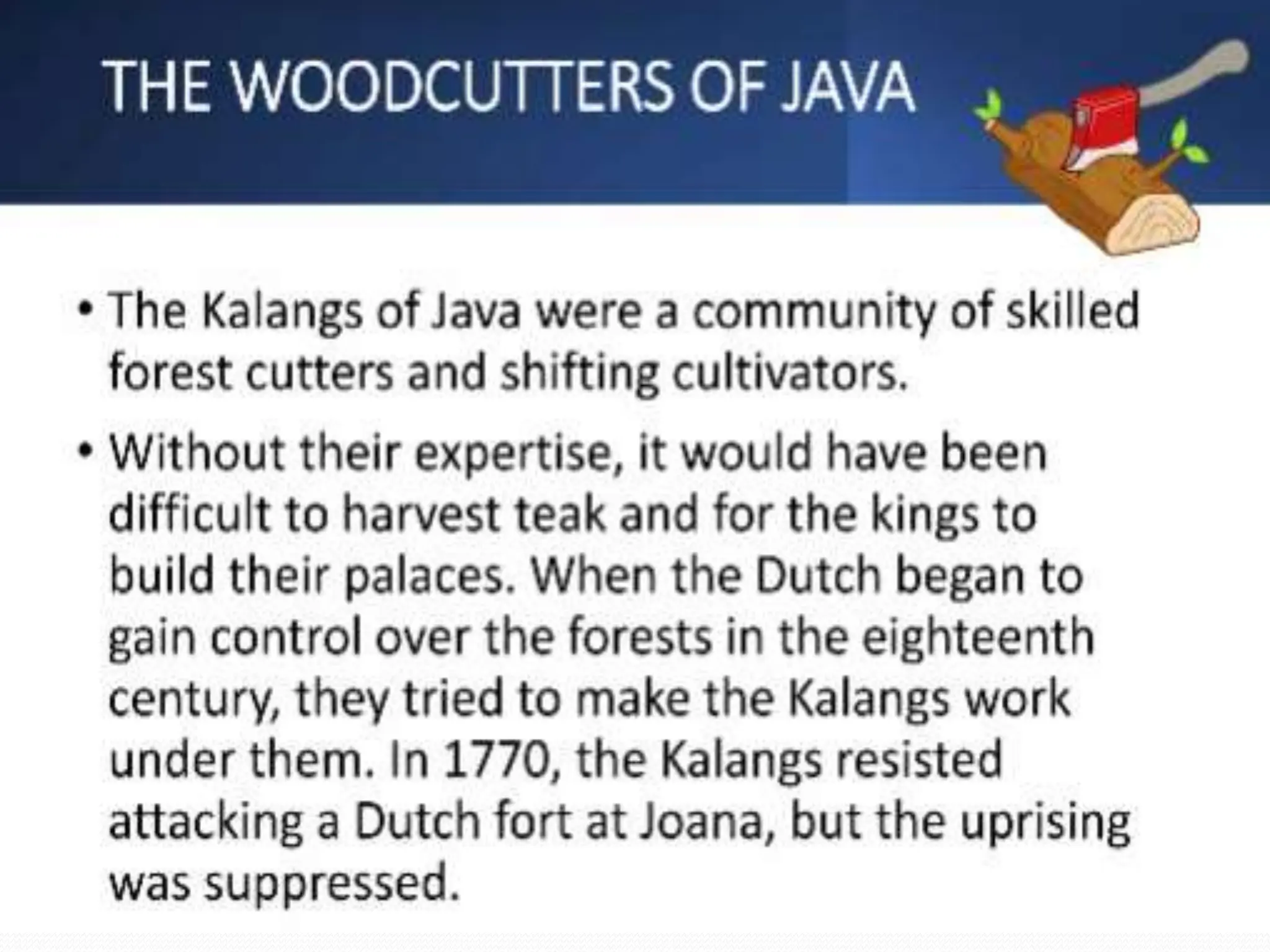 This document discusses how colonial control was established over forests in India and Indonesia. It explains that local communities traditionally used forest resources for things like bamboo, wood, fuel, grass, charcoal, packaging, fruits, flowers, and animals. However, European foresters viewed shifting cultivation practices as harmful to forests and believed it made land unsuitable for growing railway timber. The Dutch then enacted forest laws in Java that restricted villagers' access to forests and allowed wood to only be cut for specific purposes under foresters' supervision. Villagers were punished for activities like grazing cattle in younger stands or transporting wood without a permit. In summary, the document outlines how colonial powers mapped and classified forests, established plantations, and imposed restrictions that affected local