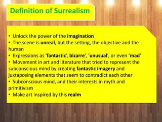 Surrealism is an artistic movement that emerged in the late 1910s, aimed at exploring the subconscious mind through fantastic and contradictory imagery. Key figures include René Magritte, Max Ernst, and Salvador Dalí, whose works reflect hallucinatory effects and personal memories. The movement produced significant manifestos and continued to influence various cultural domains, including advertising and animation.