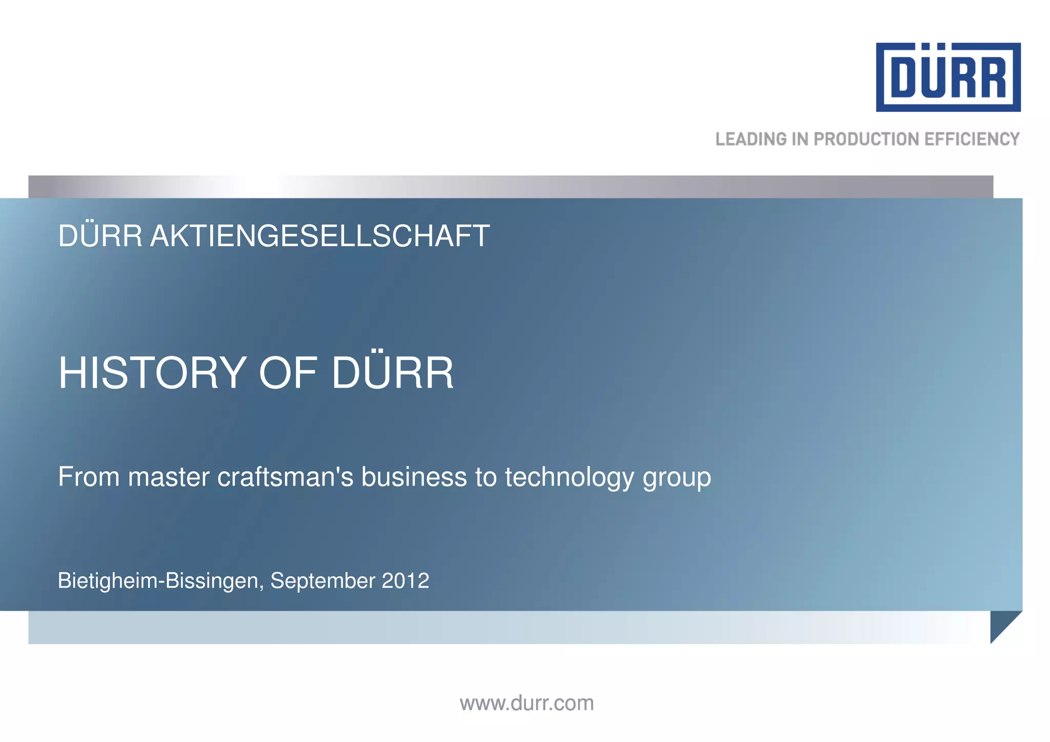 Dürr Aktiengesellschaft began in 1895 as a craftsman's metal shop in Germany. It has since evolved into an international technology group with over 7,000 employees across 23 countries. Key events in Dürr's history include establishing overseas subsidiaries in the 1960s, expanding into plant engineering in the 1950s, acquiring other companies to diversify its offerings, and relocating to a new campus in 2009 to concentrate its operations. Today, Dürr focuses on product innovations and expanding into new markets like e-mobility and energy efficiency.
