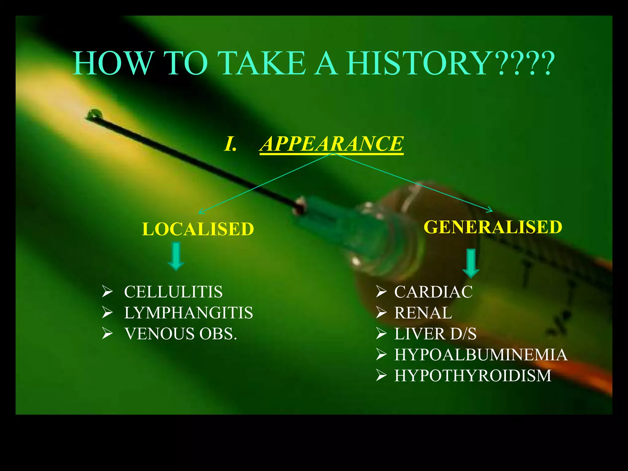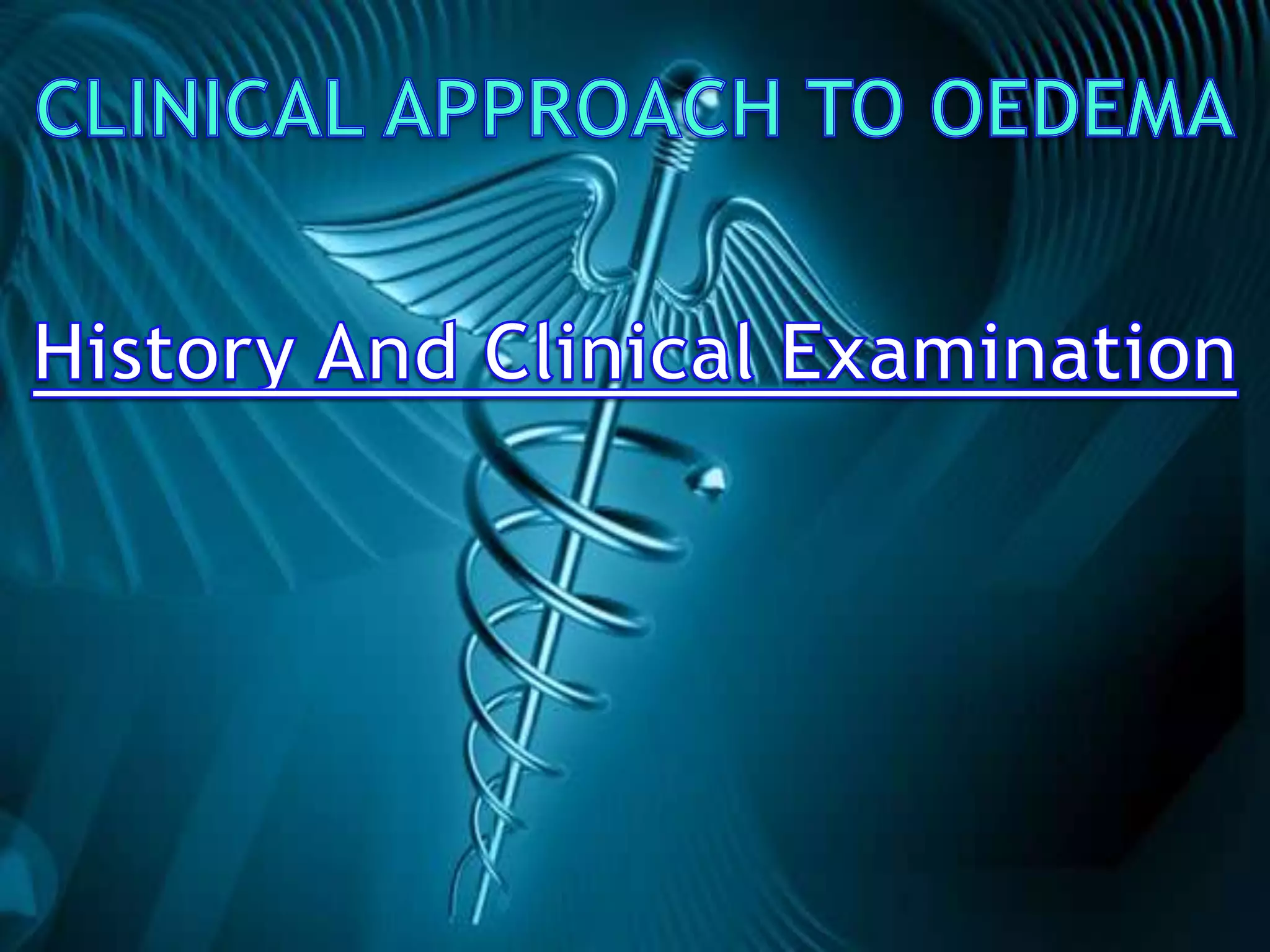 The document provides guidance on how to take a history and examine a patient presenting with edema. It discusses evaluating the appearance, onset, first site of appearance and associated symptoms to determine if the edema is localized or generalized. Examination of the patient should include assessing nutrition status, pallor, icterus, cyanosis, lymphadenopathy and vital signs. Demonstrating edema clinically involves applying pressure over bony prominences and looking for pitting. Specific examinations are described for cardiac, renal and ascites-related edema.
