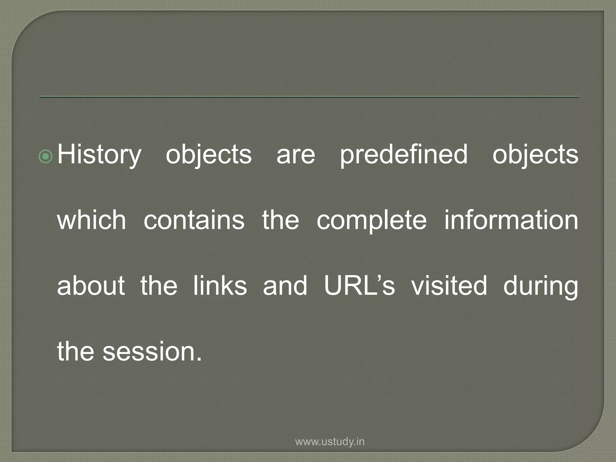 The document discusses the history object in JavaScript, which contains information about URLs visited during a browsing session. It describes several properties and methods of the history object, including length to get the number of URLs in the history, current for the current URL, next and previous for adjacent URLs, and back(), forward(), and go() methods to navigate between URLs programmatically. Examples are given using these methods to create buttons that load the previous or next page in the history list.