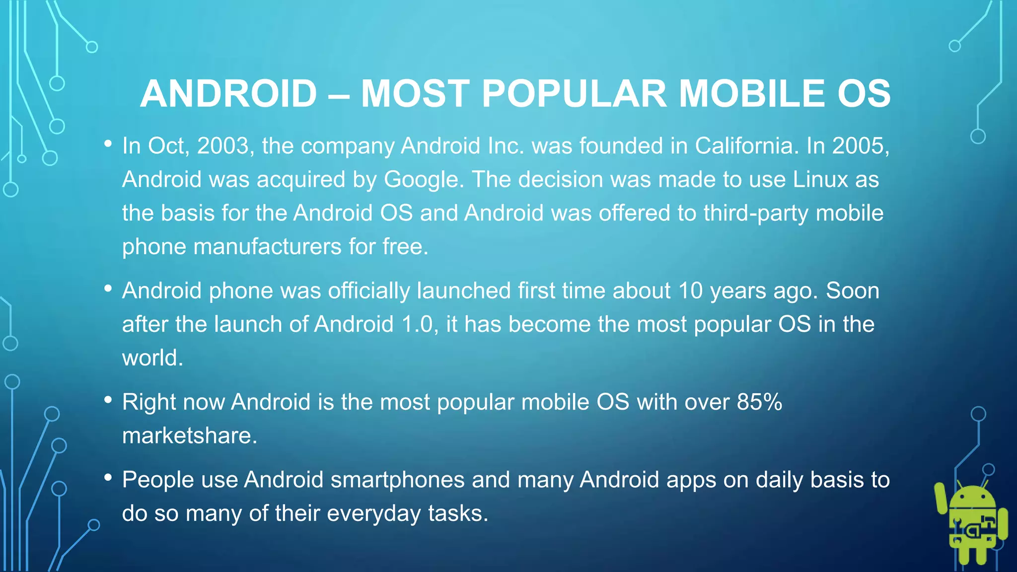 The document provides a detailed history of the Android operating system from its inception in 2003 to version 9.0 Pie, highlighting key milestones, features of different versions, and its rise to dominate the mobile OS market with over 85% market share. Each Android version is uniquely named after desserts and has introduced various enhancements aimed at improving user experience and functionality. Google continues to support and develop Android, maintaining its leadership in the smartphone industry by catering to a wide range of devices from budget to premium.