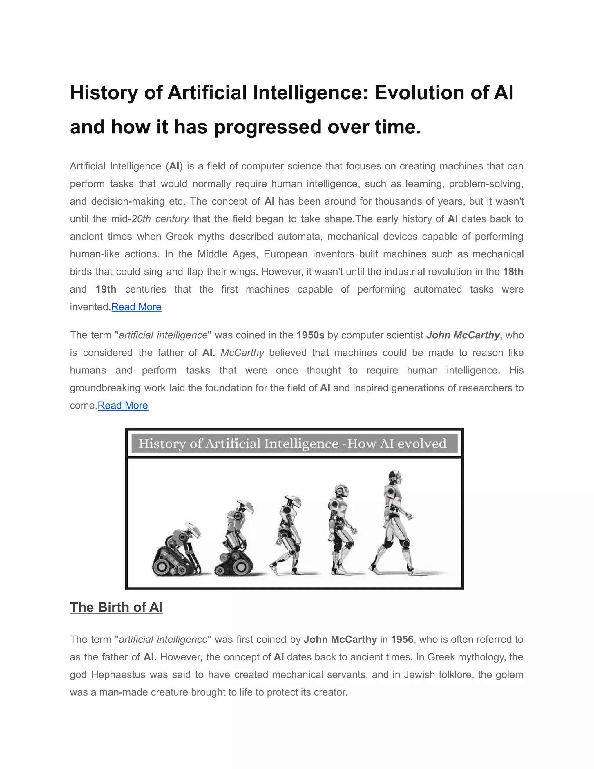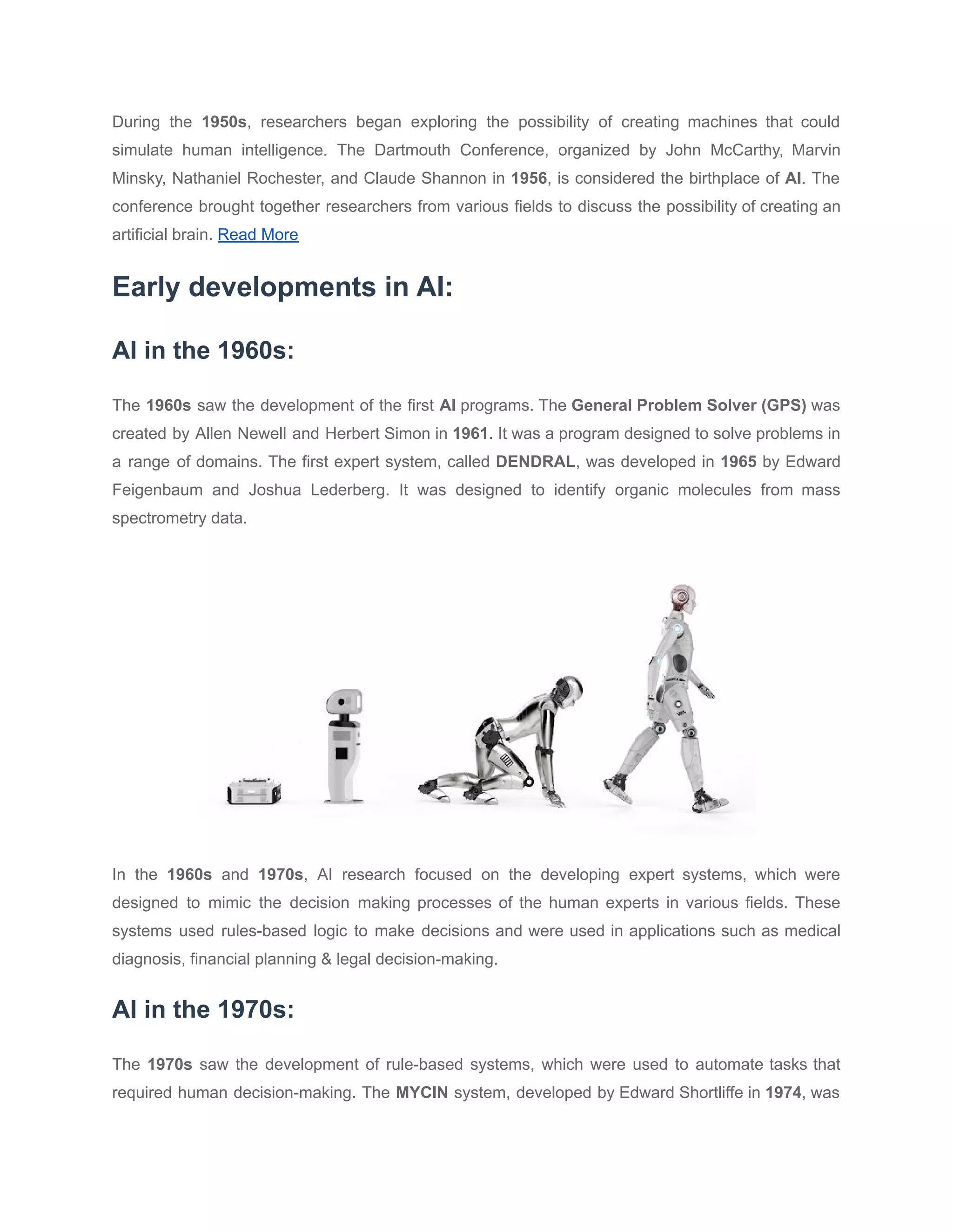 The document outlines the history and evolution of artificial intelligence (AI), starting from ancient myths and developing through the mid-20th century's foundational works by pioneers like John McCarthy. It highlights key milestones in AI's journey, including early developments in expert systems and the shift to machine learning in the 1980s, culminating in the advanced applications of AI seen in various fields today. The conclusion emphasizes the ongoing significance of AI in transforming industries and the importance of ethical considerations in its development.