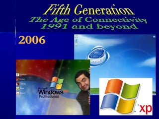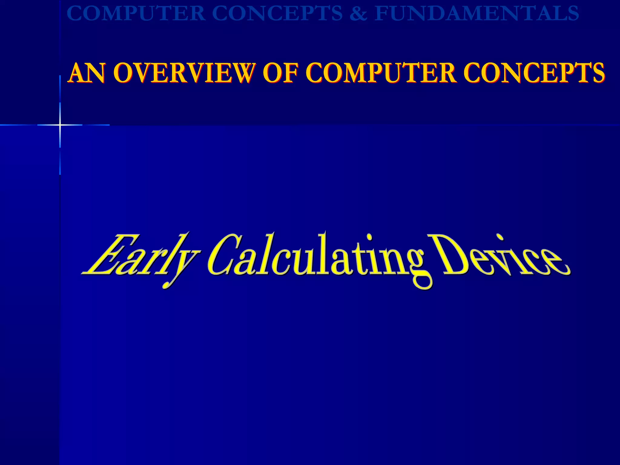 The document traces the evolution of early counting devices and computers from ancient abacuses used in China around 500 BC to modern day computers. Some of the key developments discussed include Napier's invention of logarithms in 1617, Pascal building the first mechanical calculator in 1642, Babbage conceiving the analytical engine in the 1830s, and the first general purpose electronic computer ENIAC being completed in 1946. The evolution of computers is discussed in generations from early mechanical devices and vacuum tube computers to integrated circuits, microprocessors, and today's connected world.