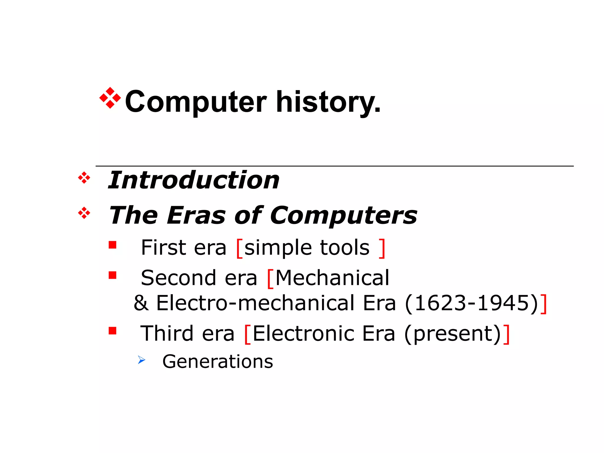 The document outlines the history of computers, detailing various eras from simple tools like the abacus through the mechanical and electro-mechanical periods to the present electronic era. It highlights key inventions, including the differential engine by Charles Babbage, Ada Lovelace as the first computer programmer, and the transition from vacuum tubes to transistors in computing. Additionally, it categorizes generations of computers and their characteristics, illustrating the rapid technological advancements that led to modern computing.
