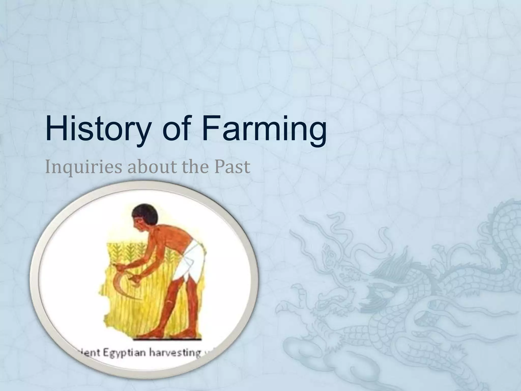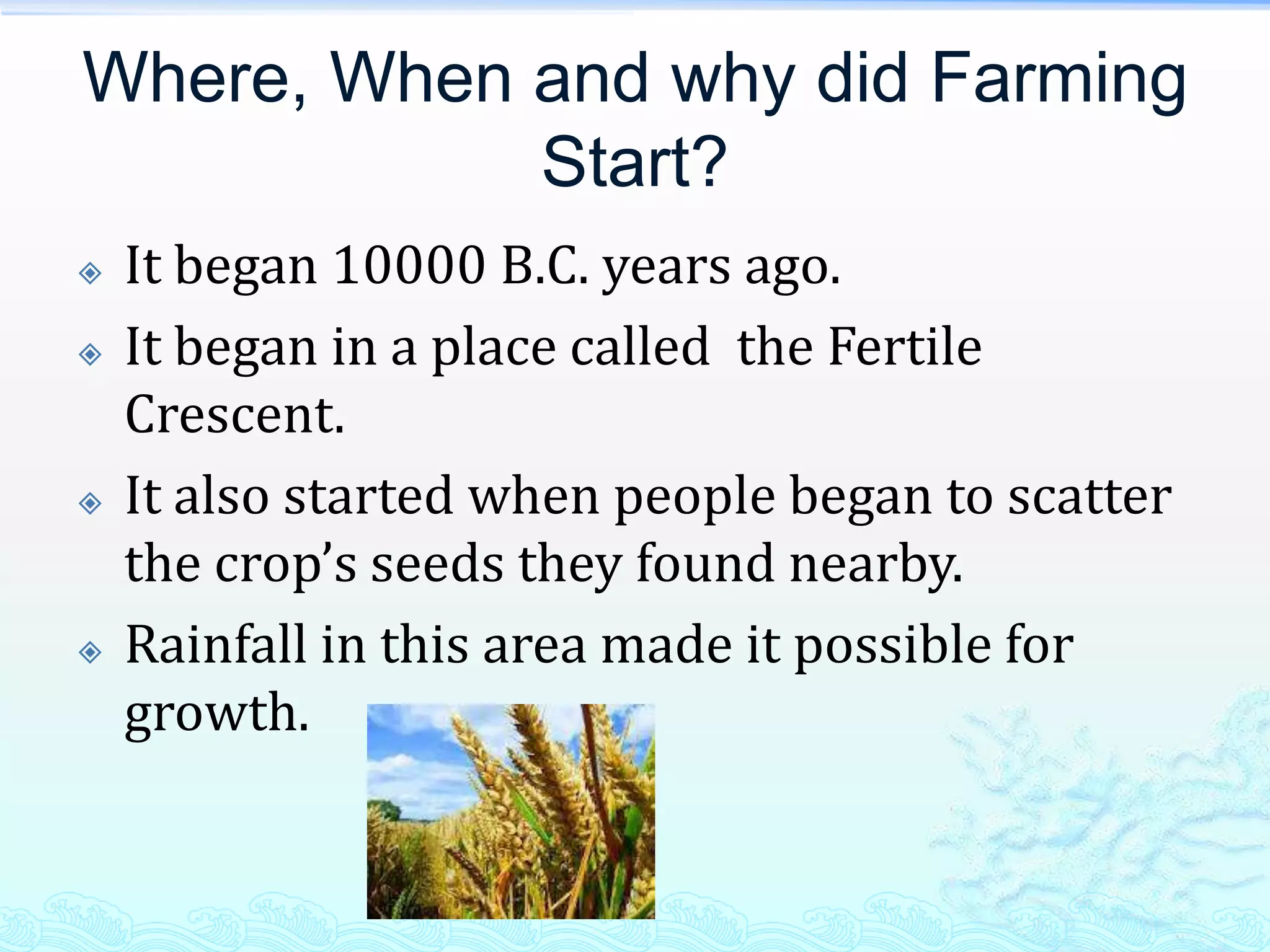 Farming originated around 10,000 BC in an area known as the Fertile Crescent. People in this region began deliberately planting seeds from local grasses and grains that they gathered, such as barley and wheat, aided by favorable climate conditions. One of the earliest farming settlements was Catalhoyuk in present-day Turkey. Farming then spread to other parts of the world and involved domesticating animals like goats, sheep and pigs to provide food, fiber and labor. Over time, humans cultivated a wider variety of crops and domesticated additional animals, advancing early agriculture.