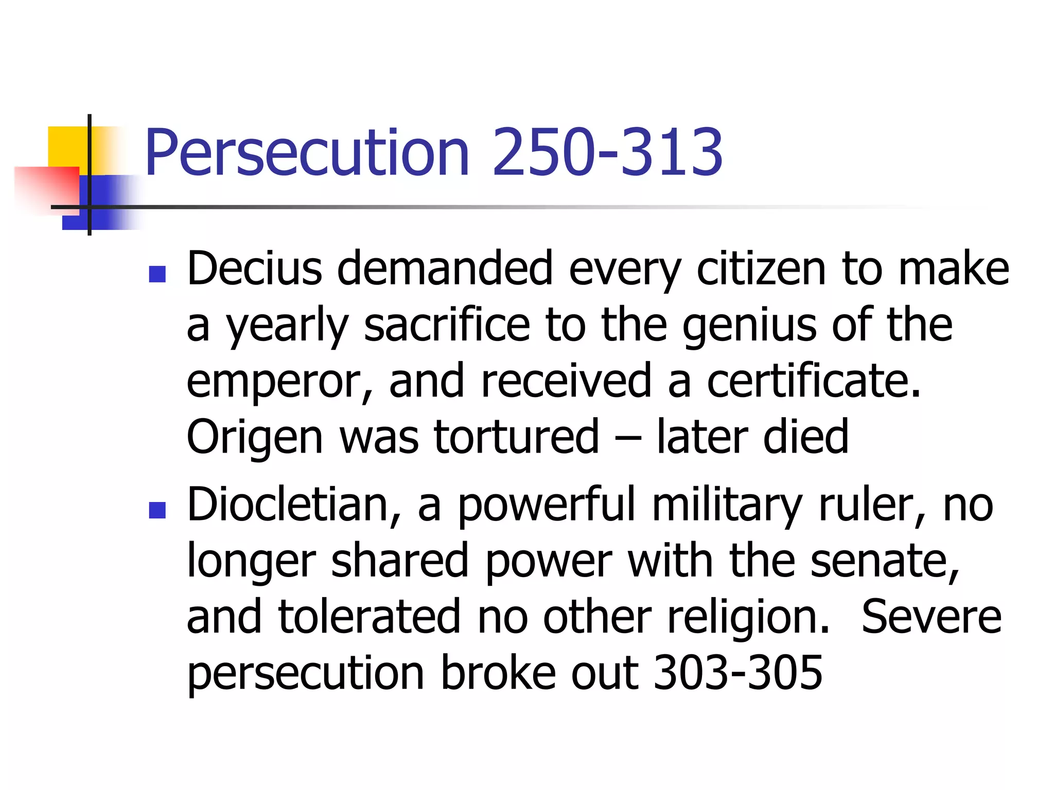 This document summarizes the early history and spread of Christianity from the 2nd to 5th centuries AD. It discusses periods of persecution under Roman emperors like Decius and Diocletian, as well as the martyrdom of figures like Perpetua and Polycarp. It also covers the development of heresies such as Gnosticism, theological debates, and the work of early Church fathers and apologists. Constantine's Edict of Milan ended persecution in 313 and Christianity became the official state religion under Theodosius I in 380. The document traces the spread of Christianity to areas like Armenia, Ethiopia, Italy, France, and England during this time period.