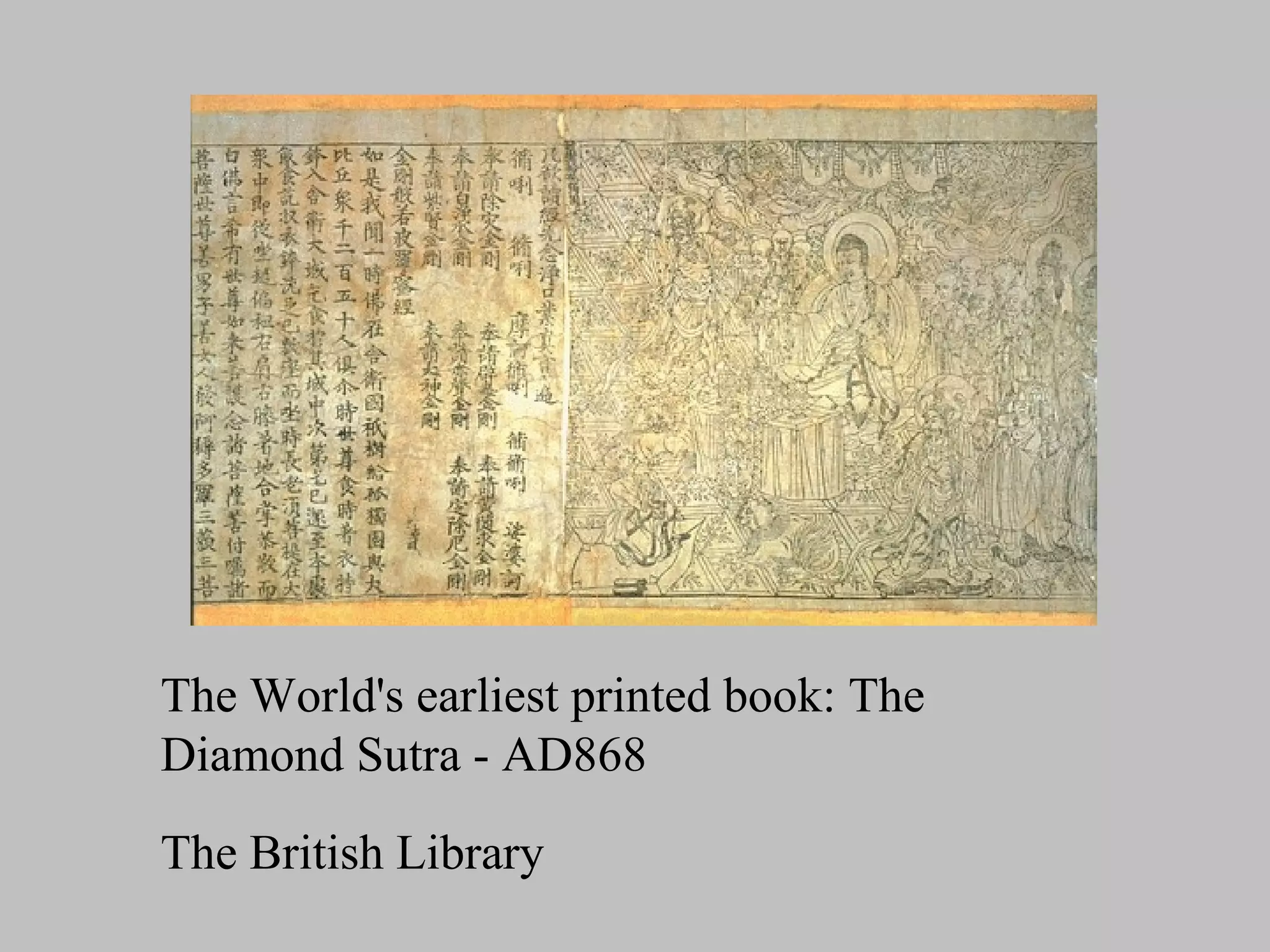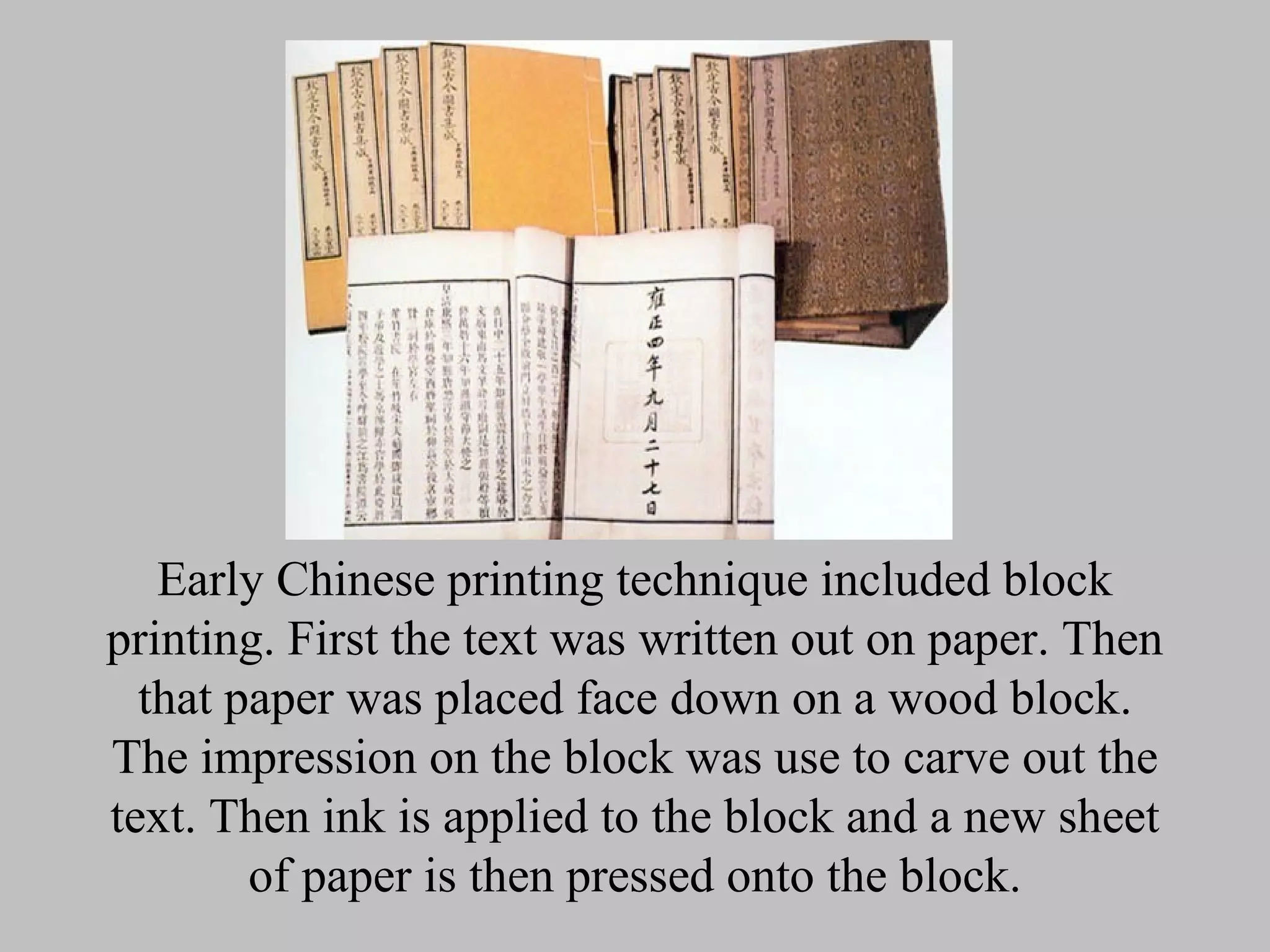 Early Chinese printing techniques involved block printing where text was written on paper, placed face down on a wood block, and the impression was carved out. Ink was applied and a new sheet of paper was pressed onto the block to transfer the text. In 1040, Bi Sheng invented movable type printing in China using removable type tables to organize different character types, which greatly increased printing efficiency.