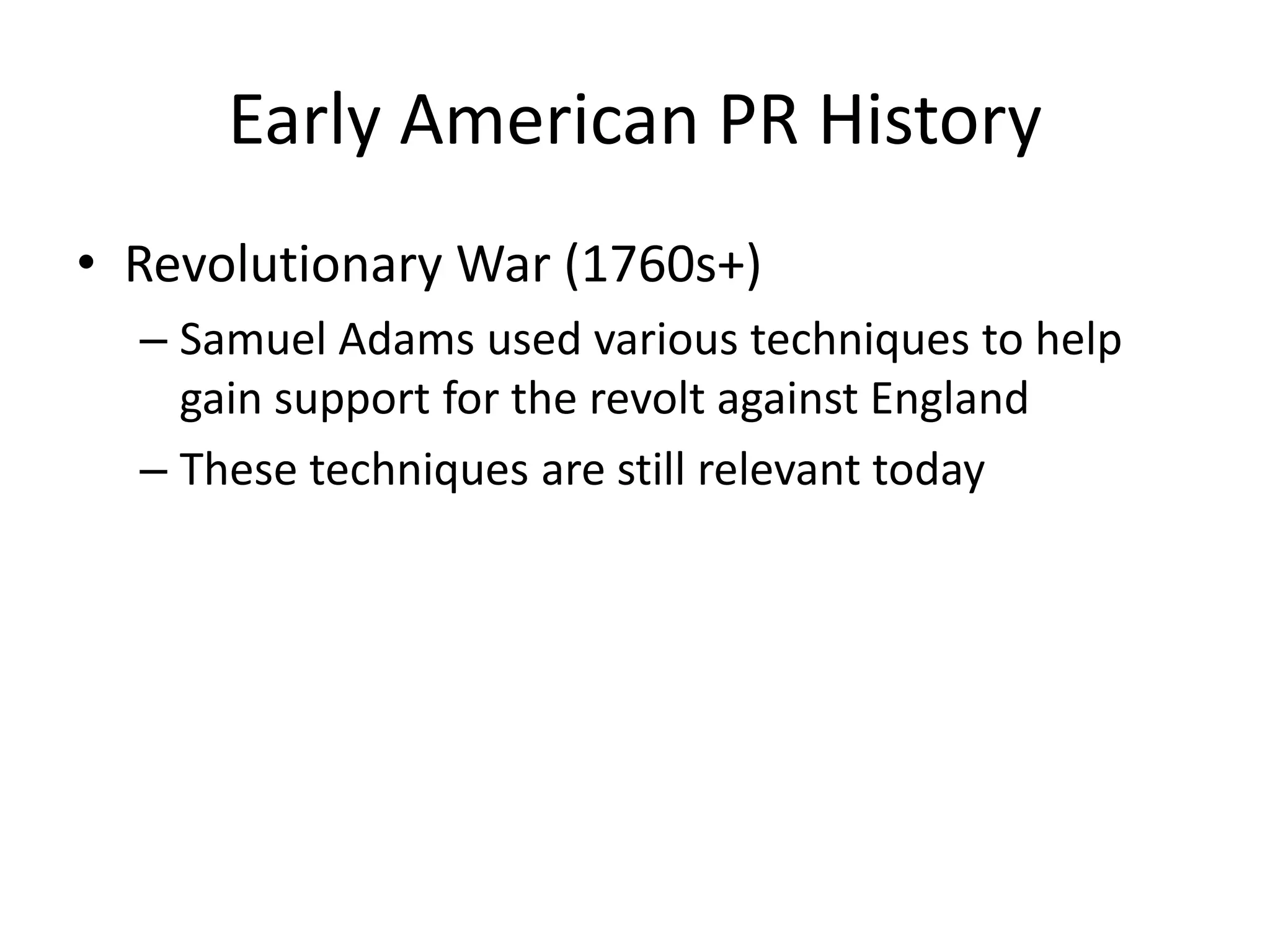 The document outlines the historical origins of public relations, highlighting key figures and events from the Revolutionary War to the digital age. It discusses early PR techniques, influential individuals like Samuel Adams and Ivy Lee, and the evolution of PR through various eras, including wartime and postwar periods. The narrative emphasizes the changing dynamics of public relations in response to societal needs and technological advancements.