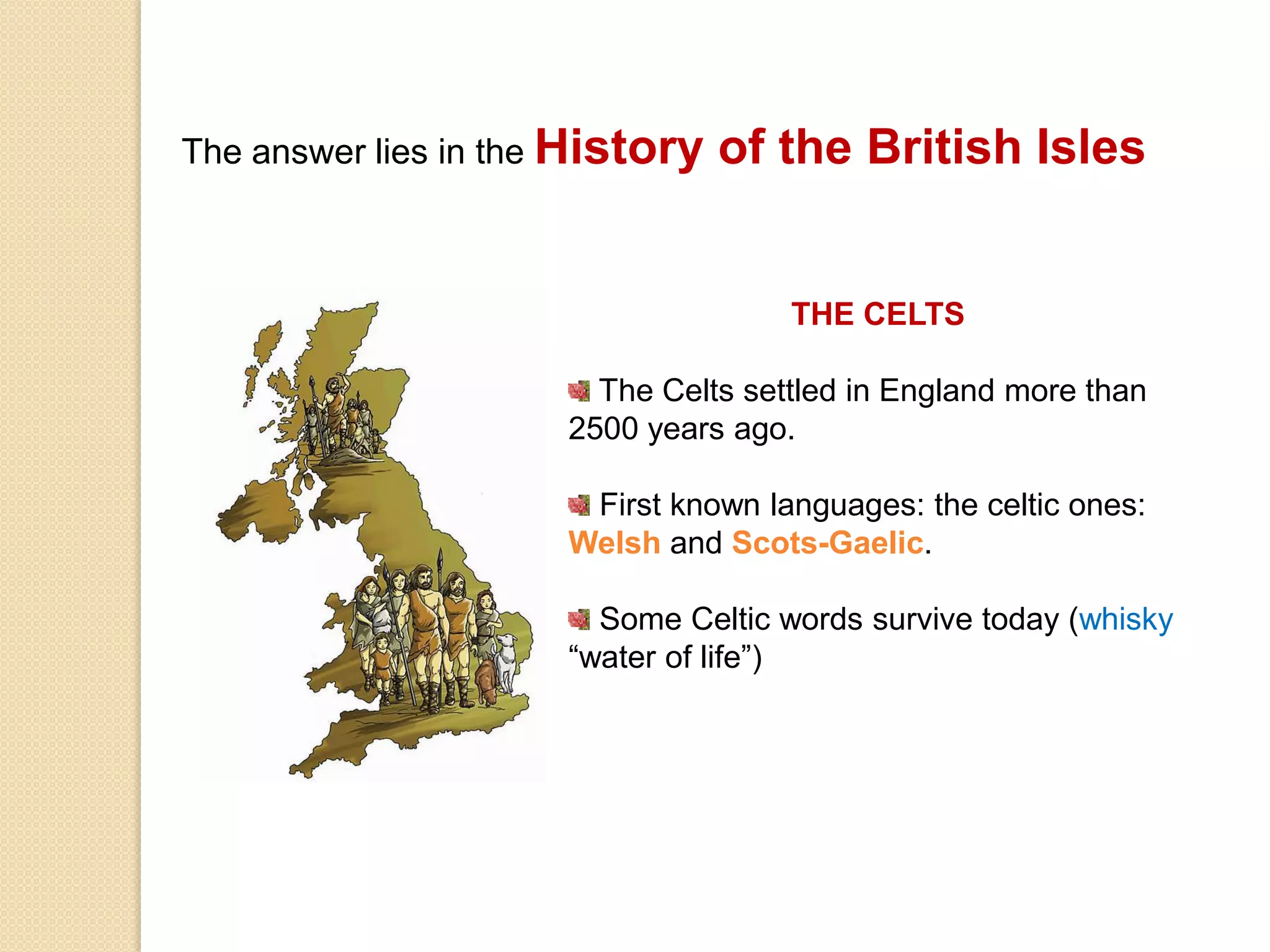 The English language has evolved over time through influences from various invading and settling groups. Celtic languages first influenced English followed by Latin during Roman rule. Old English emerged after Germanic tribes invaded between the 5th-7th centuries AD. The Norman invasion in 1066 introduced more French words to Middle English. By the Early Modern English period in the 1500s, spelling and grammar became standardized. Modern English continues evolving with influences from globalization and technology.