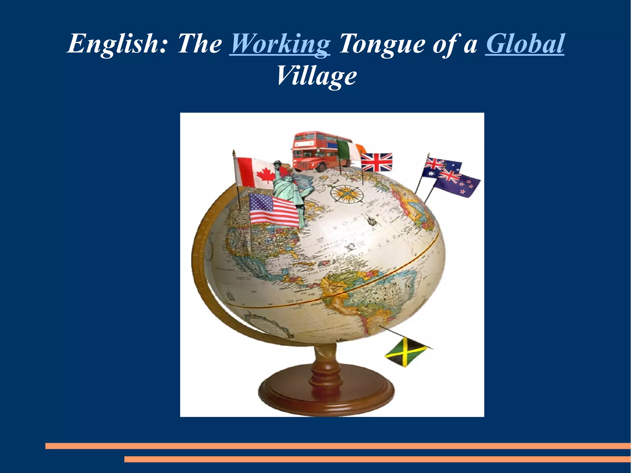 The document provides a history of the English language and how it became a global language. It discusses how English originated from various roots and became the working language of the global village due to factors like British colonialism, the power of the United States, and increasing need for international communication. The document also analyzes the three concentric circles of English - the inner circle where it is a first language, the outer circle where it is a second language, and the expanding circle where it is a foreign language. It notes how non-native English speakers now outnumber native speakers.