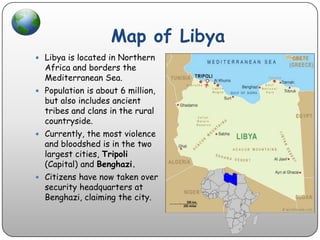 1) Libya is currently experiencing political unrest, with the most violence occurring in the major cities of Tripoli and Benghazi between citizens and government forces.