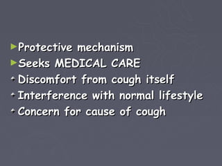 This document outlines the clinical approach to evaluating a patient presenting with cough, including taking a thorough history. Key aspects of the history include determining onset and duration of cough, characterizing the cough, examining sputum production, and identifying aggravating/relieving factors and associated symptoms. A detailed medical history including past illnesses, treatments, and family history is also important. Differential diagnoses that may cause cough include pneumonia, asthma, COPD, bronchiectasis, and lung cancer among others. A targeted history can help identify the underlying cause and guide appropriate management.