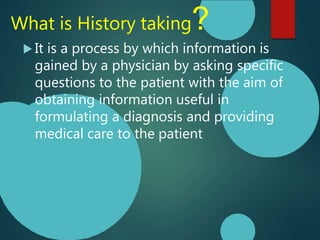 The document outlines the process and importance of history taking in medical diagnosis and care. It explains that obtaining an accurate history from the patient is the critical first step, and that a physician can make a diagnosis in 70% of cases based on the history alone. The document then describes the components of a thorough history, including the patient's profile, chief complaint, history of present illness, past medical history, family history, social history, and a systems review. An effective history takes practice and focuses on active listening, building rapport, and involving the patient to understand their experience fully.