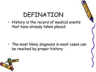 History taking involves collecting information about a patient's medical history, presenting complaints, past illnesses, family history, and social history. It is important for determining the most likely diagnosis. The health care provider collects details about the patient's name, age, sex, religion, address, presenting complaints like fever, headache, vomiting, and convulsions. They also gather information about the history of present illness including onset, duration, and characteristics of symptoms. Details of past medical, obstetric, vaccination, and family histories are also obtained to help identify potential causes of the current condition.