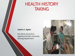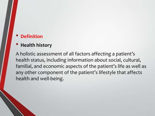 The document outlines the process and importance of health history taking, emphasizing a holistic assessment of factors affecting a patient's health, including social and familial influences. It provides a structured guide for healthcare professionals to document pertinent information, including presenting complaints, medical history, and review of systems. The ultimate goal of thorough history taking is to aid in accurate diagnosis and effective patient management.