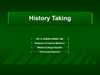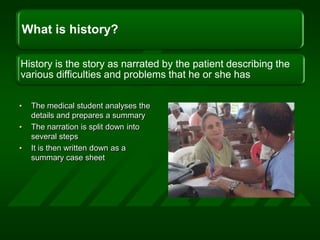 The document provides guidance on taking patient history and summarizing clinical cases. It emphasizes listening to the patient's description of symptoms and events, only prompting when needed. Key details to document include the patient's identifying information, medical history, presenting symptoms and their duration, relevant risk factors and family history. The summary should concisely restate the important symptoms and chronology of the case without including verbatim details from the history.