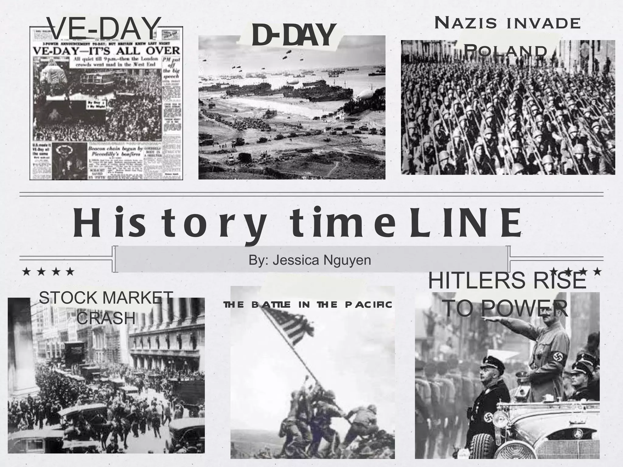 The document provides a timeline of major events in history from the 1930s through World War 2. It includes the stock market crash of 1929, Hitler's rise to power in 1933, key events of World War 2 such as the Nazis invading Poland in 1939 and D-Day in 1944, and the liberation of countries like the Netherlands from German occupation in 1945. The timeline covers political, economic, and military developments across Europe and in the Pacific theater during this pivotal period of the 20th century.