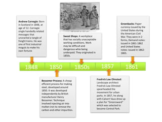- Andrew Carnegie establishing himself as an industrial mogul in the steel industry in the late 1860s.