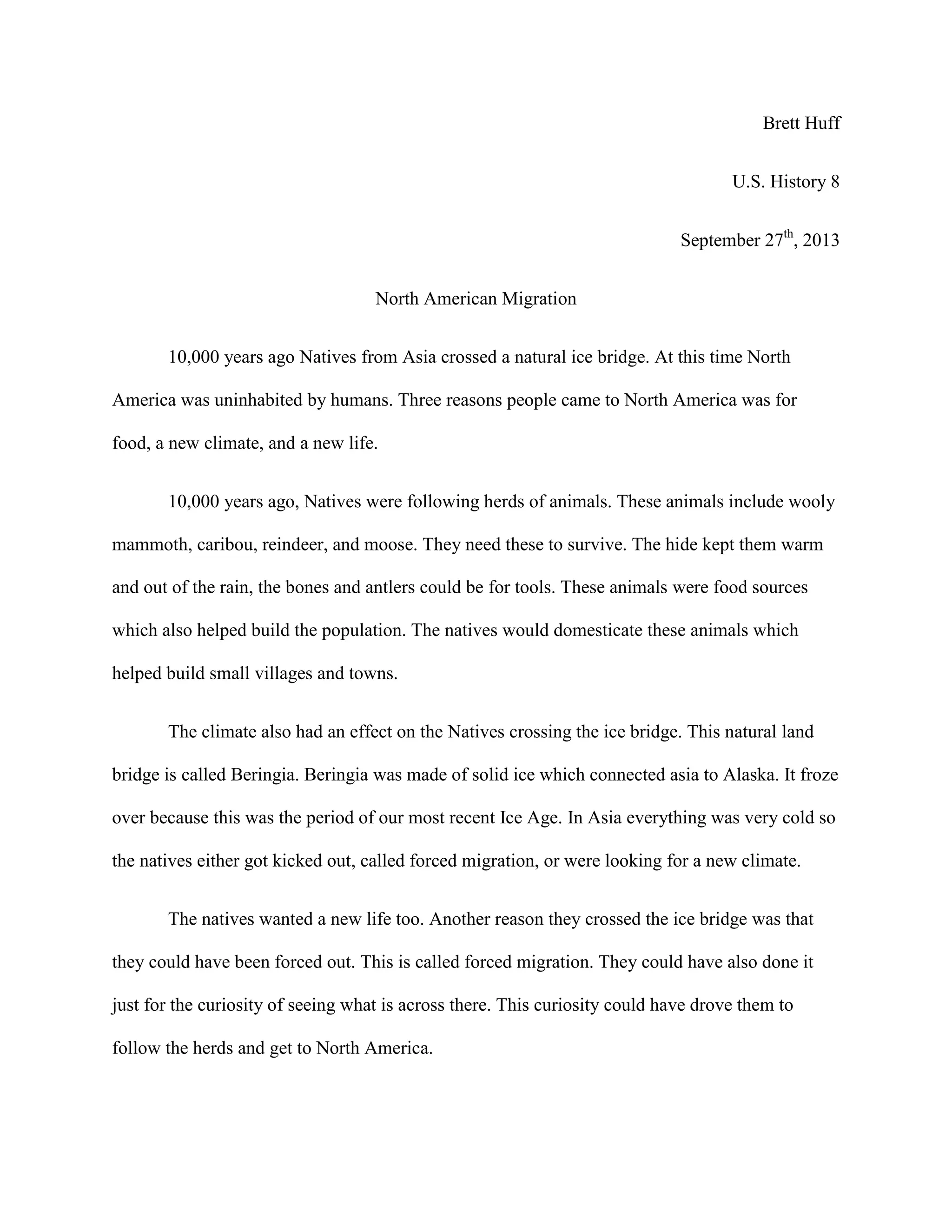 The document summarizes the reasons for early human migration to North America around 10,000 years ago. It states that Native peoples from Asia crossed a natural ice bridge between Siberia and Alaska during an Ice Age period when lower sea levels exposed the land bridge. They followed animal herds for food and survived by hunting mammoths, caribou, and other game. The changing climate in Asia also drove migration as people sought more hospitable temperatures. Curiosity and a desire for new opportunities additionally prompted the first humans to cross over and establish settlements in North America.