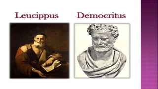 The ancient Greek philosophers Leucippus and Democritus first proposed the atomic theory in the 5th century BC. They believed that all matter is composed of indivisible atoms moving through empty space, and that different kinds of atoms exist which give matter its properties. John Dalton later expanded on this theory in the 19th century, stating that atoms are indivisible, indestructible particles that do not change during chemical reactions. J.J. Thomson's discovery of the electron led to the "plum pudding" atomic model, with electrons distributed throughout a sphere of positive charge. Ernest Rutherford then proposed the nuclear model of the atom as a tiny dense nucleus surrounded by orbiting electrons.