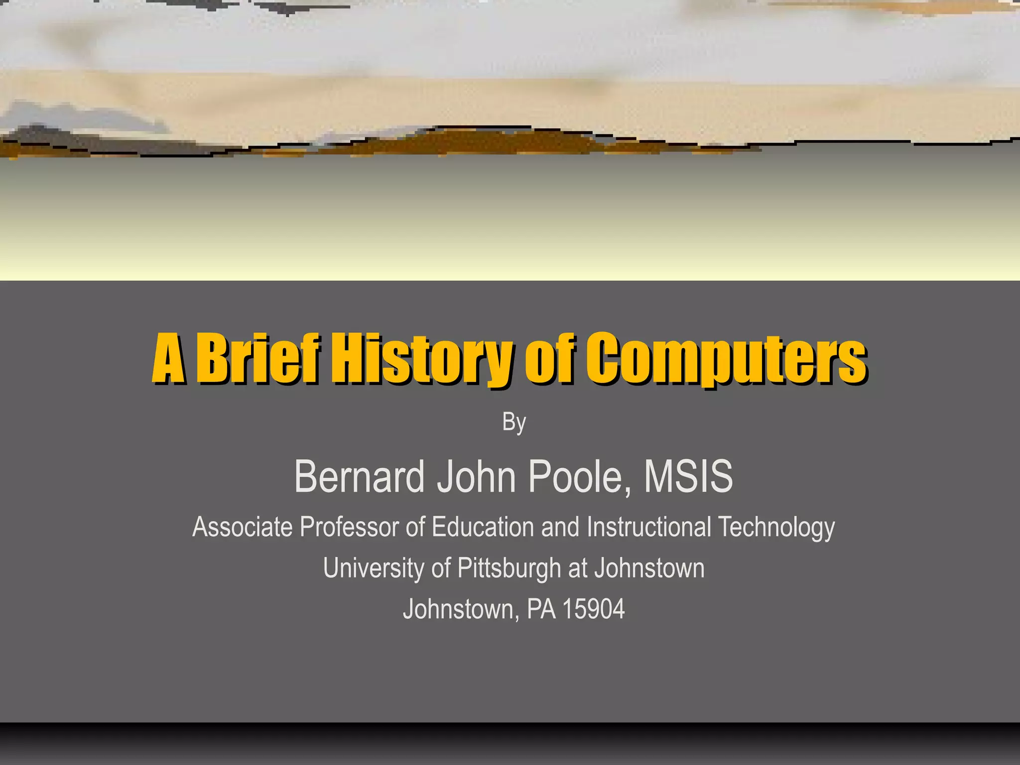 This document provides a brief history of computers from early counting methods like fingers and pebbles to modern electronic digital computers. It describes the evolution of mechanical computing devices like the abacus and Babbage's analytical engine. Important early electronic computers are highlighted such as the Atanasoff-Berry Computer, ENIAC, and UNIVAC. The development of key technologies like the integrated circuit, microprocessor, and internet are noted. The history shows how computers advanced rapidly from vacuum tubes to transistors to semiconductors.
