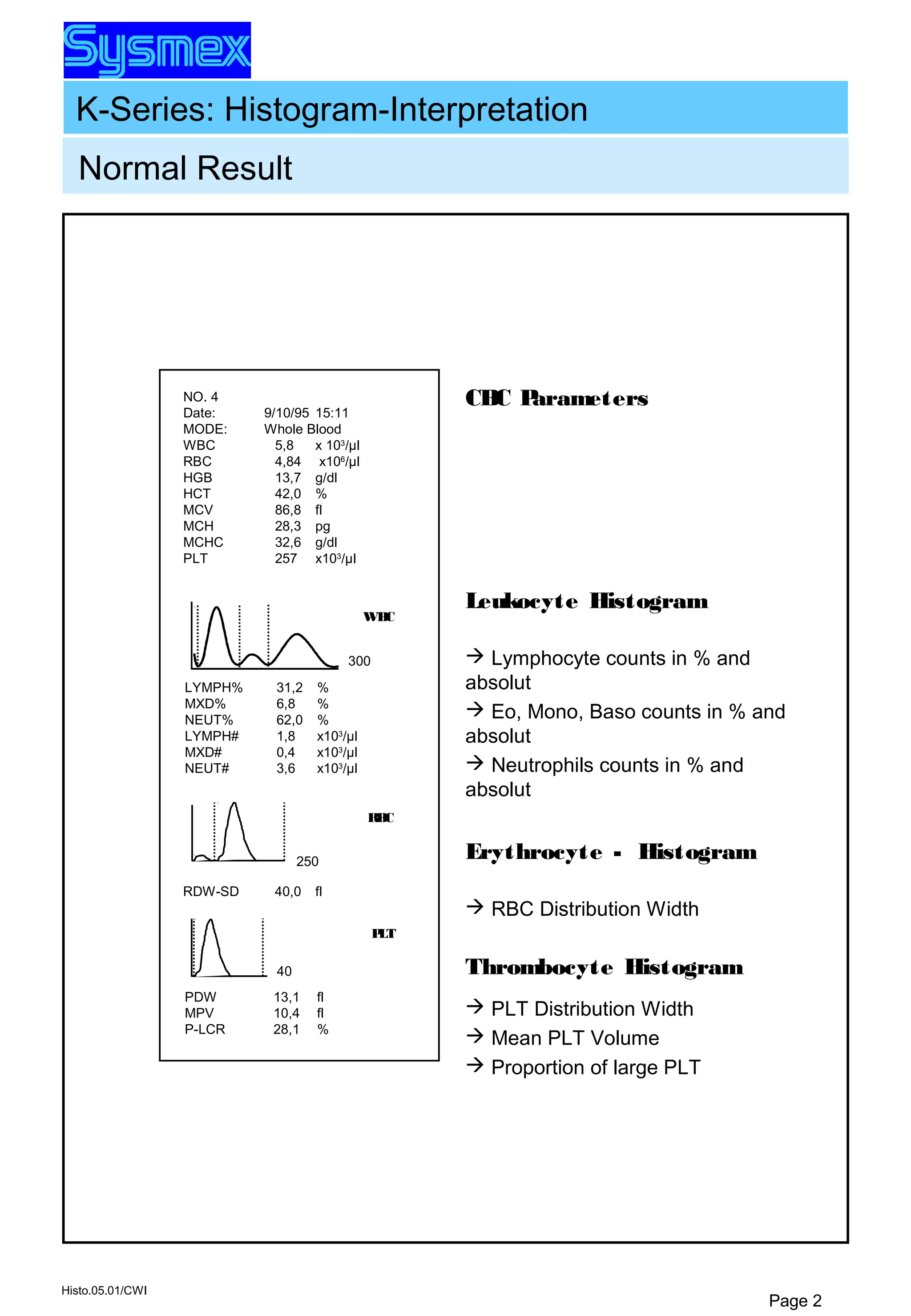 This document provides information about interpreting histograms from a complete blood count (CBC) test. It describes how histograms of white blood cells, red blood cells, and platelets are analyzed to determine counts and distributions of different blood cell types. Key parameters like mean platelet volume and red blood cell distribution width are explained. The document also outlines different flags that could be applied to histograms to indicate issues like abnormal curve heights or widths. It provides normal ranges for blood parameters and describes potential causes for issues flagged in histograms.