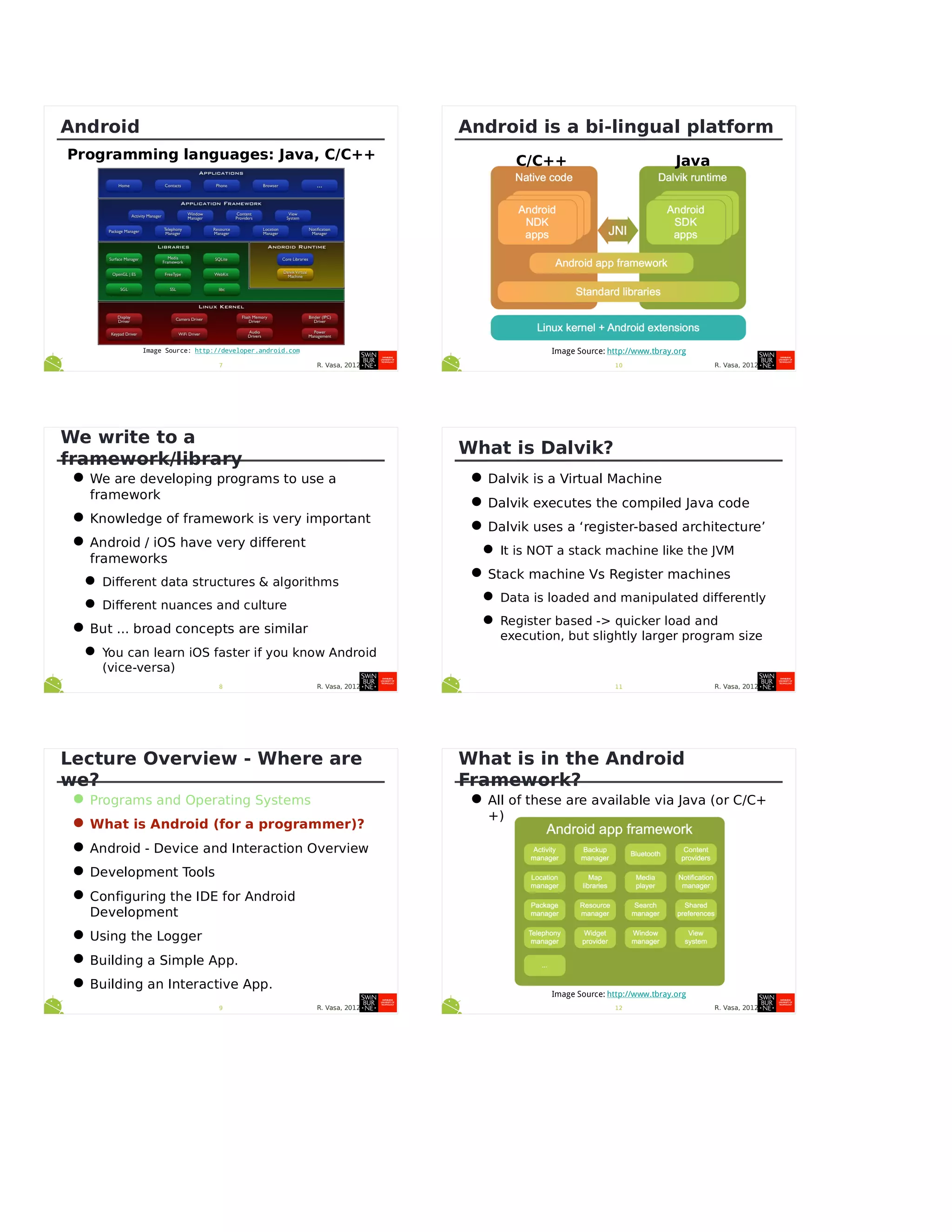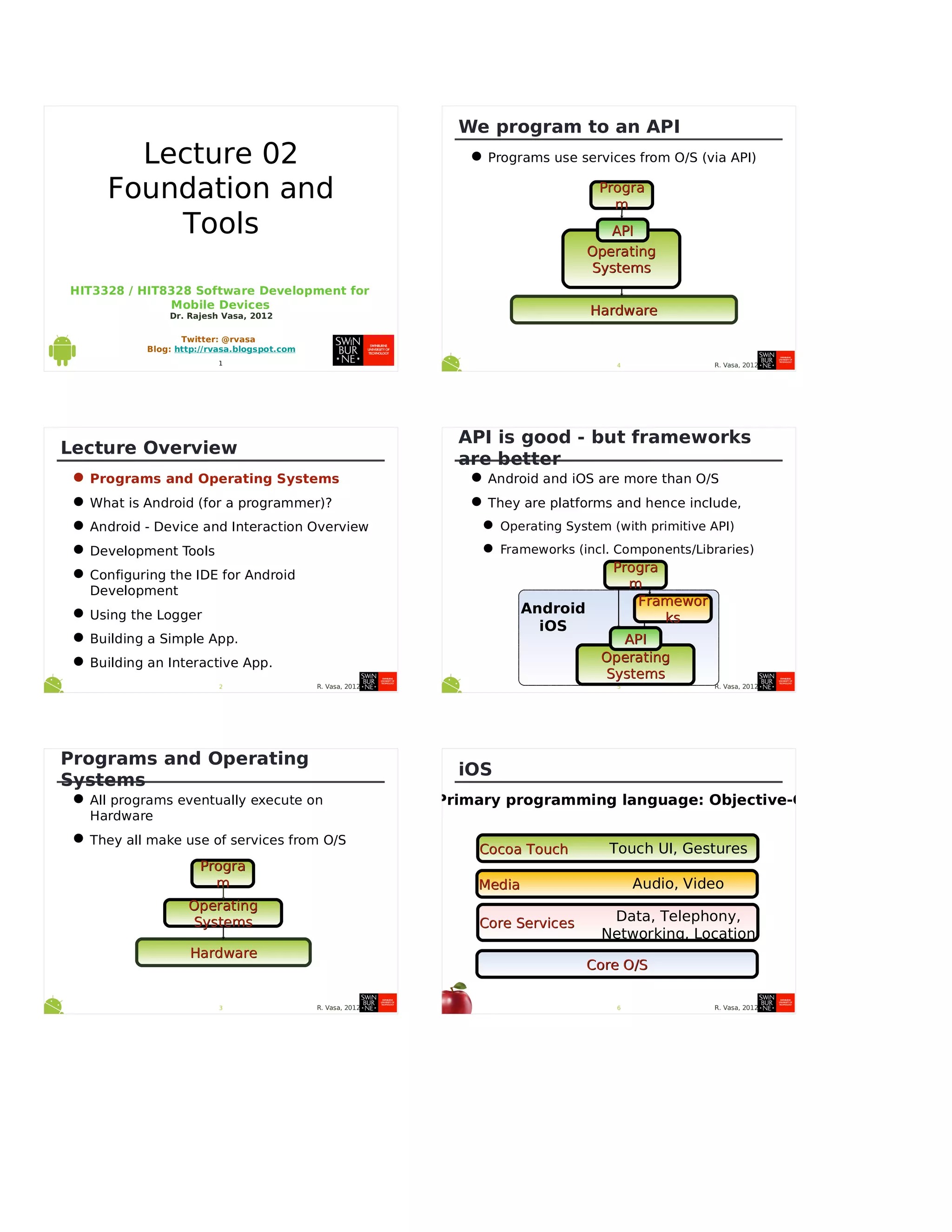 This document contains lecture notes on mobile application development for Android. It discusses the fundamentals of programs and operating systems, and provides an overview of what Android is for programmers. It covers Android development tools like the Eclipse IDE, Android SDK, and emulator. It also discusses configuring the IDE for additional insight through logging and emulator control. The document demonstrates how to build a simple Android app with a linear layout, text and image views. It explains the concepts of activities, views, view groups, and resources in Android apps.