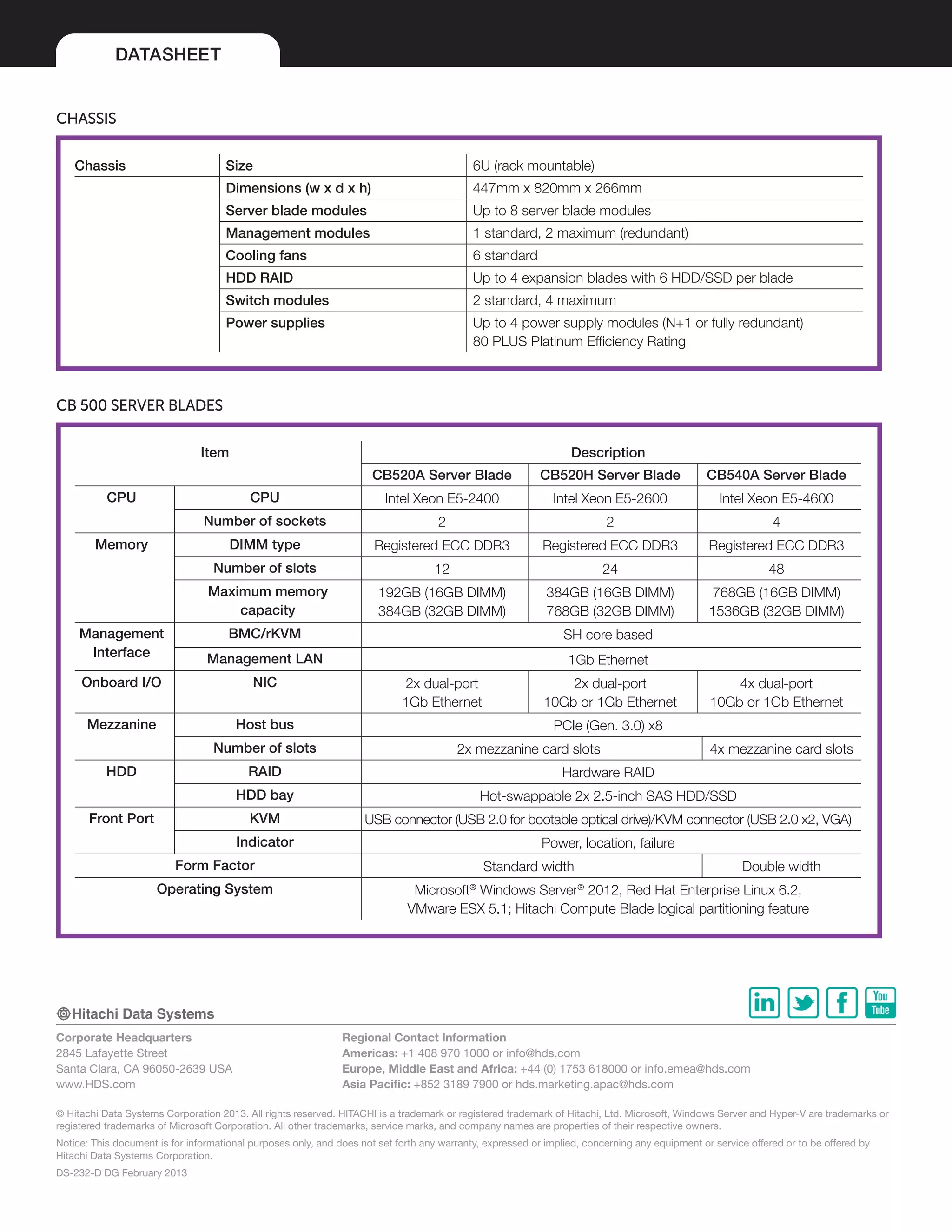 The Hitachi Compute Blade 500 is a highly reliable server platform designed for virtualization and cloud computing, featuring superior performance and scalability with Intel Xeon processors. It supports a wide range of configurations, including multiple CPU and memory options, and offers integrated networking solutions to simplify data center operations. Additionally, its logical partitioning feature allows for improved application performance while keeping total ownership costs low.