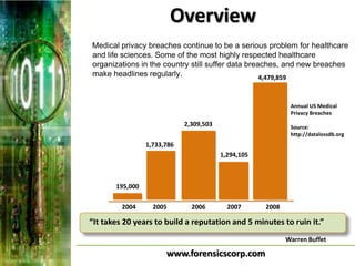 The document discusses the ongoing issue of medical privacy breaches in healthcare, highlighting the significant financial and reputational damage these incidents can cause. It outlines the provisions of the HITECH Act, which provides funding to support electronic health record systems while expanding HIPAA's compliance requirements and enforcement penalties. The document emphasizes the need for healthcare organizations to implement strategic data classification and information management practices to better protect patient information and mitigate breaches.
