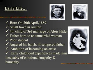 Adolf Hitler was born in 1889 in Austria and showed early ambitions of becoming an artist, though he was rejected from art school. He volunteered for the German army in World War I and was disturbed by Germany's defeat. Hitler joined the Nazi party and became its leader, gaining popularity through fiery speeches appealing to national pride and blaming the Treaty of Versailles for Germany's struggles. While in prison for attempting to overthrow the government, Hitler wrote his book Mein Kampf outlining his beliefs in German superiority and the need for dictatorship. The Nazis rose to power amid the Great Depression and Hitler became Chancellor, establishing a dictatorship and embarking on World War II by invading Poland. Defeated and isolated, Hitler committed suicide in 1945.