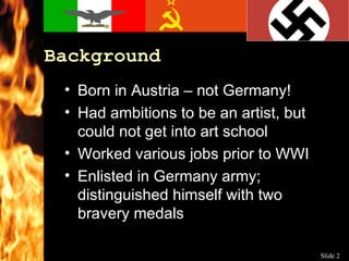 Adolf Hitler was born in Austria and failed to get into art school. He served in the German army during WWI and joined the Nazi party after the war. The party gained popularity by blaming Germany's postwar weakness on politicians, France, communists, and Jews. After a failed coup attempt, Hitler was imprisoned where he wrote Mein Kampf outlining his vision of uniting German-speaking peoples and removing Jewish and Slavic influences. The Nazi party platform called for rejecting the Treaty of Versailles, removing non-Aryan influences like Jews, rebuilding the military, and providing social services to German citizens.