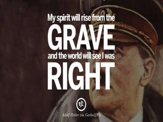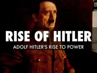 The document outlines Adolf Hitler's rise to power, starting from his early life in Austria and serving in World War I, to his leadership of the Nazi Party and establishment of a dictatorship in Germany. It describes key events such as the Beer Hall Putsch, the passing of the Enabling Act, and the use of fear and propaganda through the SA and SS. Additionally, it touches on the indoctrination of the Hitler Youth and the horrors of concentration camps experienced by soldiers like Eisenhower, emphasizing the extreme brutality of the Nazi regime.