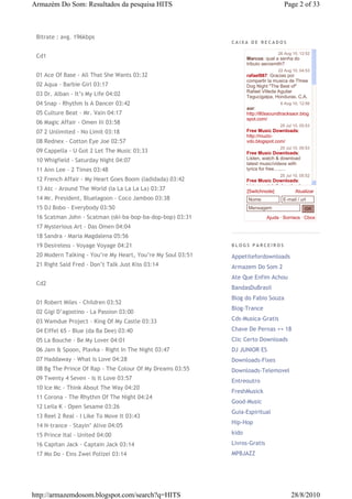 The document is a blog post from "Armazém Do Som" sharing a two disc compilation album of dance hits from Blue System called "Maxi Hits (G.H.) 2008". It provides the track listing, details about the album such as genre, year, quality and size. It also includes rapidshare download links and password to download the album files.