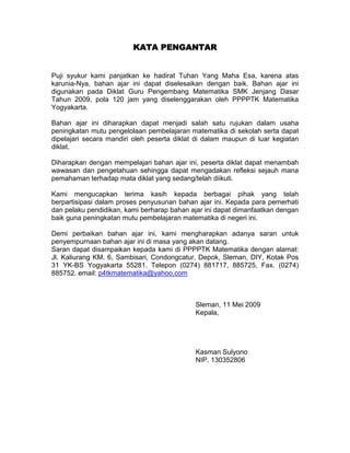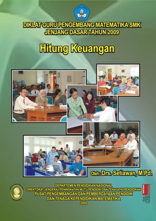 Bahan ajar ini disusun untuk diklat guru pengembang matematika SMK jenjang dasar tahun 2009, bertujuan meningkatkan mutu pengelolaan pembelajaran matematika. Materi mencakup ilmu hitung keuangan seperti bunga tunggal, bunga majemuk, rente, anuitas, dan penyusutan, dengan fokus pada pemahaman aplikatif. Diharapkan peserta dapat memperdalam wawasan dan memanfaatkan materi ini secara mandiri.