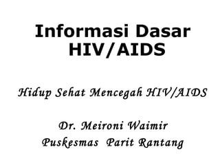 Dokumen ini memberikan ringkasan tentang HIV/AIDS di dunia dan Indonesia. Jumlah kasus HIV/AIDS global mencapai 33,2 juta orang dengan 2,5 juta kasus baru dan 2,1 juta kematian per tahun. Lebih dari 96% kasus terjadi di negara berpenghasilan rendah dan menengah. Penularan utama di Indonesia melalui jarum suntik dan hubungan seks tidak aman. Hanya tes darah yang dapat mengetahui status HIV seseorang. Pencegahan melal