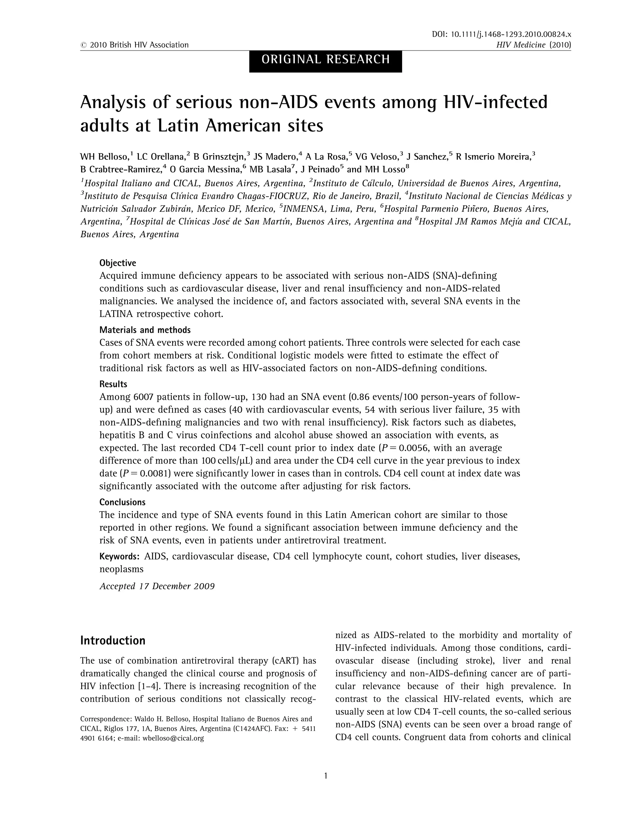 This study analyzed serious non-AIDS events (SNAs) among HIV-infected adults in Latin America. The researchers identified 130 patients with SNA events out of 6007 patients in the cohort, representing an incidence rate of 0.86 events per 100 person-years. Risk factors like hepatitis B/C coinfection, diabetes, and alcohol abuse were associated with SNA events. Lower CD4 cell counts prior to and at the index date were significantly associated with SNA events occurring, even in patients receiving antiretroviral treatment. The study found HIV-associated immune deficiency increased the risk of SNA events.