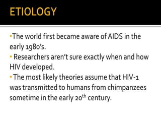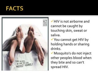 - Modes of HIV transmission including unprotected sex, blood transfusions, and mother-to-child transmission.