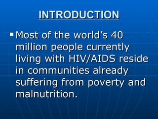 This document discusses the relationship between HIV/AIDS and nutrition. It notes that HIV contributes to and is affected by nutritional status, and that malnutrition increases the severity of HIV/AIDS. Poor nutrition can accelerate the progression of the disease and reduce the effectiveness of medications. The document recommends that people with HIV/AIDS consume a diet that is higher in calories, protein, and micronutrients in order to support the immune system and increase quality of life. Regular nutritional assessments and customized diets are important for managing the disease.