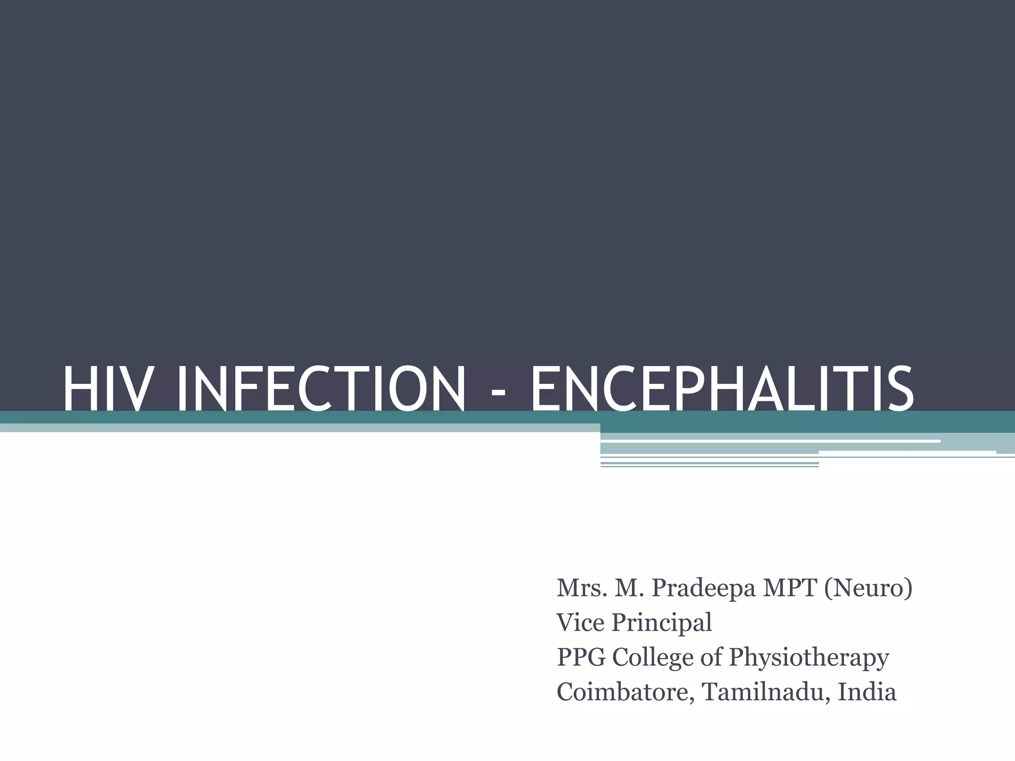 - Symptoms of HIV encephalitis include decreased cognition, psychomotor slowing, and motor symptoms like gait instability. Diagnosis involves neuropsychological testing and neuroimaging. Treatment includes antiretroviral therapy and