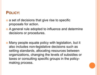 This document discusses HIV policy issues and provides a framework for analyzing public policies related to HIV. It defines policy and outlines the policymaking process. It also identifies some key HIV policy issues such as access to voluntary counseling and testing, antiretroviral treatment, and mandatory testing. Additionally, it presents a practical framework for linking research to policymaking by understanding the political context, presenting relevant evidence, and building relationships with stakeholders.