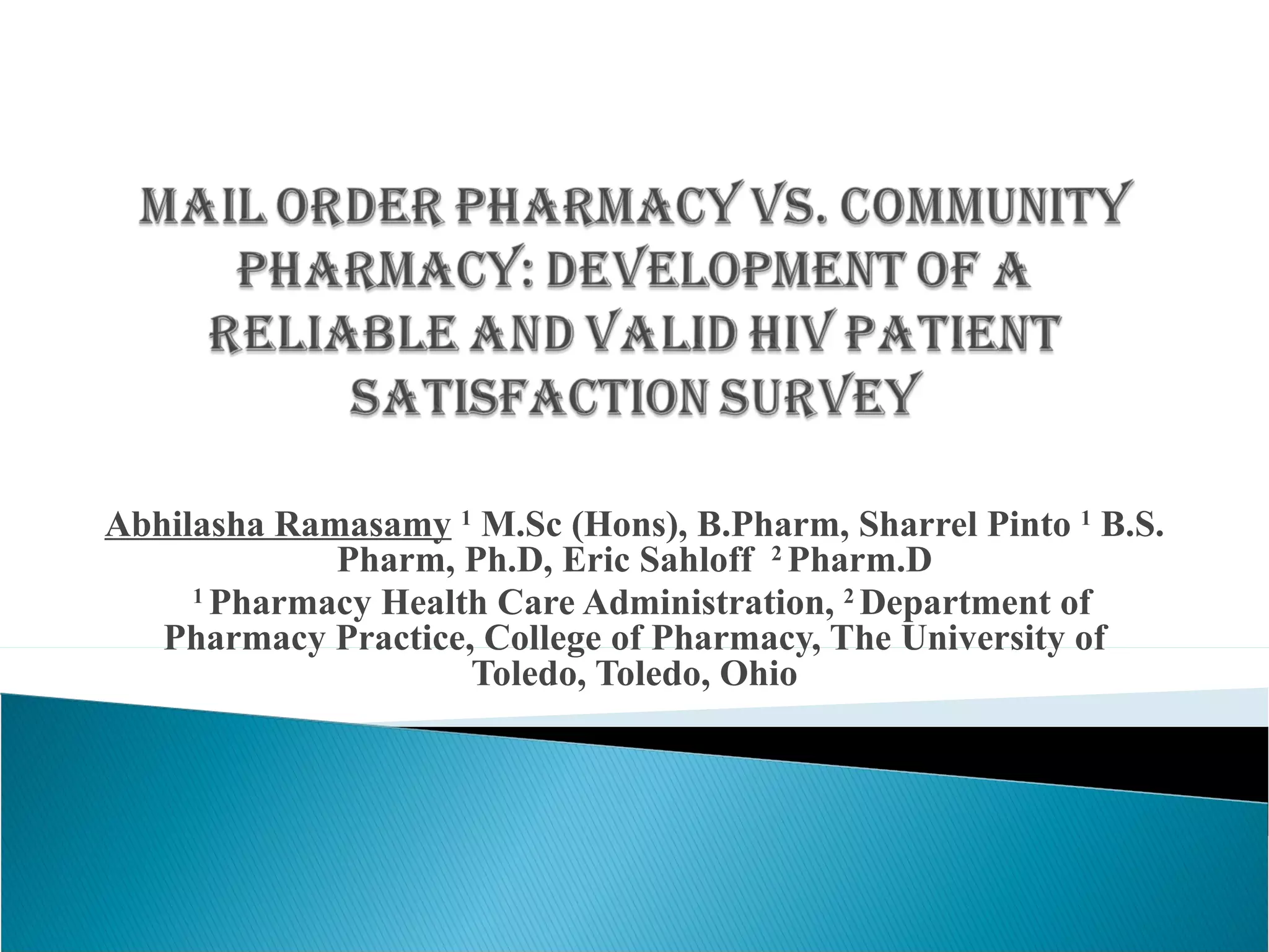 The document describes a study that developed and tested a survey instrument to measure patient satisfaction with pharmacy services among HIV-infected patients receiving care from either a mail-order or community pharmacy. Exploratory factor analysis established the construct validity of the survey and showed two key factors. Reliability testing found high internal consistency. The survey can be used to compare patient satisfaction across different pharmacy settings and inform efforts to improve patient-reported outcomes.